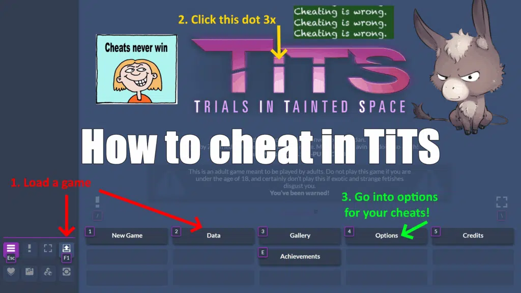 You can unlock the new cheat menu by clicking the top of the โiโ in the TiTS logo three times right after loading your save (check out the image below). Once activated, youโll find the cheat menu in the gameโs Options screen.